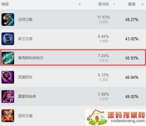 这是韩服统计出来妖姬对于每件装备的登场率,“科技枪”已经变为仅次于“鞋子”和“多兰”的存在。这说明现在大家更愿意选择“科技枪”这件装备,但“深渊”和“鬼书”仍然具有市场,不过对妖姬的提升不如前者,所以胜率依旧不如。