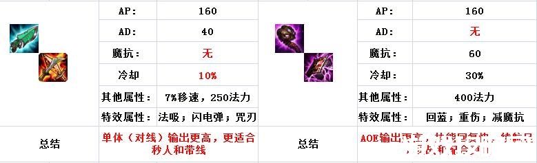 我们可以来对这两种出装的属性进行对比,可以看出,就面板属性(AP)来说都是一样的,换句话说就是在技能清兵和技能伤害上,这两种出装实际相差不大。唯一的区别就在于“特效”上,科技枪巫妖的组合更能够在对线和单带上取得优势,这非常对应版本,同时能将妖姬“秒C”的性质发挥到极致。