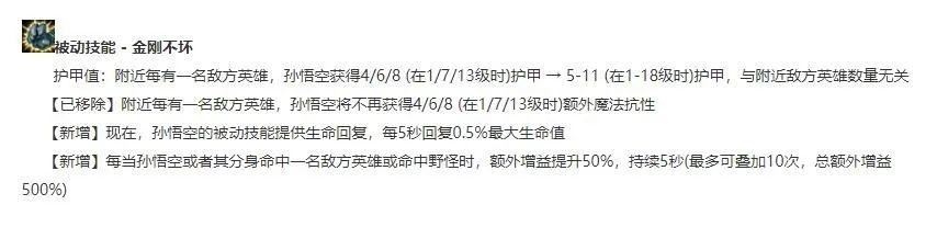 猴子被动大改是亮点之一,老被动只提供少量双抗,中后期被动几乎没用。而新被动在持续作战的情况下提供生命回复和大量护甲,增强了猴子坦度和对线能力,这意味这猴子不用花费过多金币投资在护甲装上,打法和定位也更偏向于战士。