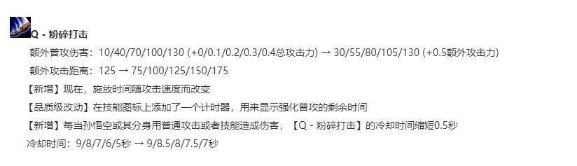 Q技能改动不大和以前差不多,但增加了普攻和技能伤害会减少Q技能0.5秒冷却时间,并且满级Q额外攻击距离多了175码。Q技能改动让猴子能够频繁使用技能,增加持续作战能力,攻击距离的加长让猴子面对位移英雄更加从容。