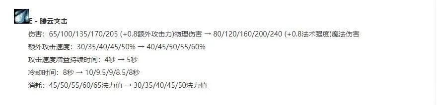 E技能和以前一样,但伤害类型从物理伤害改为魔法伤害和AP加成,穿甲装收益变低,纯穿甲流猴子后期会出现伤害不足的情况。所以新版E技能偏功能性,主要是用来位移和加攻速。