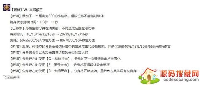 W技能改动是此次猴子重做的灵魂,新版分身不再是鸡肋技能,不仅有一小段位移,且分身会普通攻击和模仿Q技能或R技能,相当于小型劫分身。更容易骗到人也能打更多的伤害。注意,防御塔攻击到分身分身会被秒杀!