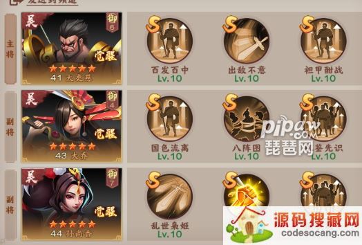这套阵容的核心仅在于太史慈和大乔自带技能即可,如下图自带技能百发百中、国色流离、学习技能八阵图、袒甲酣战基本就是这套阵容的完美核心了,给太史慈再配上一个出敌不意、回马枪、一击止啼等普攻后二次伤害的技能(当前版本普攻后再次伤害的技能一抓一大把,完全不用考虑获取难度)都能打出很好的效果:先攻、百分百命中、一回合3次普攻、+50%普攻伤害、每次普攻额外效果,开局就能给对方造成大量伤害,这样基本上每次战斗很快就能结束战斗并且自身损伤都非常低。