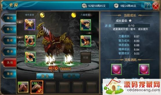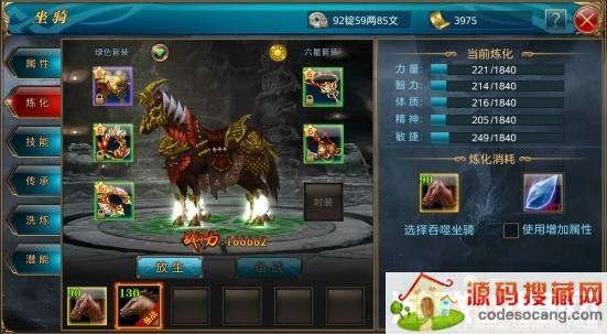 玩家坐骑不仅是外观的象征,也是实力的象征!而对坐骑我们可以进行炼化,炼化可以促进备战坐骑,也就是当前的坐骑的属性强化。但是需要牺牲一些马牌或者是马匹,通过吞噬一些低中级的马匹或者马牌,来增加备战坐骑的属性强化。一般的坐骑吞噬炼化,可能只是促进几点的属性加成或者没有属性加成,这是因为低品质的马匹已经不能满足于当前马匹的炼化需求了。这时候则需要通过增加炼化水晶来增加属性加成,即使炼化吞噬低品质的马匹,也能够得到属性加成。不过一般不建议这么做,因为这样会降低炼化水晶的利用率,一般中等品质马匹炼化吞噬再加炼化水晶,就可以得到较多的属性加成。比低品质的要多得多,也提高了炼化水晶的利用率。而炼化水晶获取途径也是从日常任务中而来,所以完成游戏任务才是提升战力的有效方式。