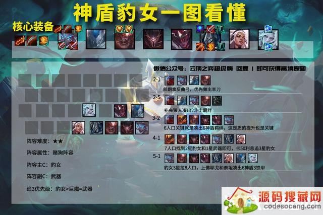 神盾豹女是一套以豹女为主C的阵容,新版本豹女的技能得到了重做,变身后跳到背后能够增加攻速,这无疑是让以豹女成为新版本的主C。
