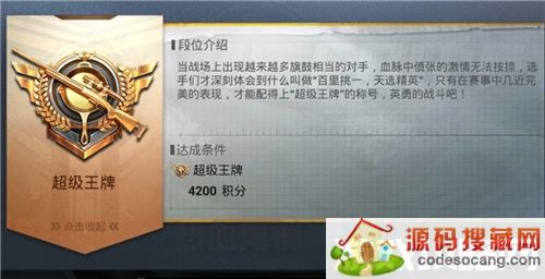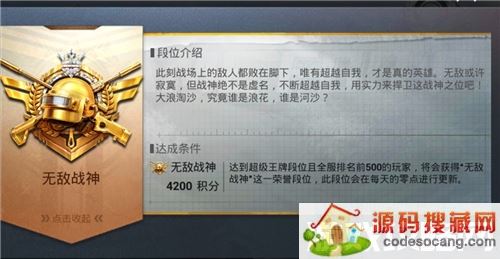 无敌战神:达到超级王牌段位,并且积分全服排名前500的玩家,才能达到无敌战神段位。