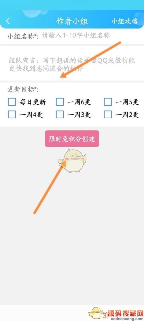 4、输入小组名称、组队宣言,选择更新目标,点击创建即可。