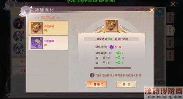 2、神饰装备可以强化等级和提升阶级,多余的装备可以用来分解,分解后可获得强化材料,用于强化神饰装备的等级,提升战力。当装备强化到一定等级时可以消耗升阶材料进行提升装备阶级。