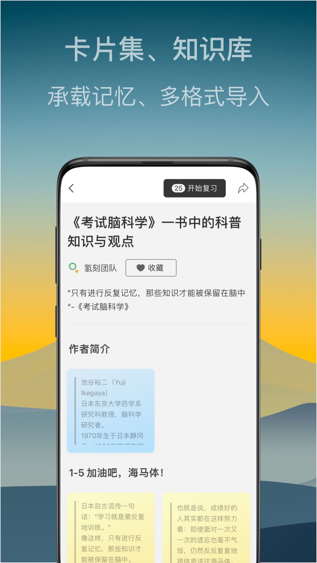氢刻 - 全平台同步的卡片记忆工具,包含了卡片笔记、智能学习、科学统计、内容共享社区等功能。多端使用,云端数据同步,特别适合考研、考证和考公等学习使用。氢刻通过卡片的方式捕捉信息、知识、想法等,再通过类似Anki的科学智能的学习与回顾,实现信息与知识的高效转化,帮您记忆,助您思考。通过氢刻,可以打造自己的卡片知识库,让记录不再仅仅是大量的文字,通过结构化的卡片式管理,精准捕捉重要信息;依靠强大的检索,让您提取内容高效且快捷,帮助您更好地管理信息。卡片式记录,打造自己的卡片知识库让记录不再仅仅是大量的文字,通过结构化的卡片式管理,精准捕捉重要信息;依靠强大的检索,让您提取内容高效且快捷,帮助您更好地管理信息。科学的卡片式学习,保持记忆在氢刻创建的各种知识卡片、信息卡片、想法卡片,都可以通过氢刻的学习功能进行学习。 根据你的学习进度,自动为您推荐需要学习的卡片,让您更加轻松且科学的形成记忆。遗忘会随时间的流逝而先快后慢,遵循遗忘曲线的记忆规律,在合理的时间及时进行复习,才是有效的学习方法,氢刻帮助您在合理的时间进行复习, 闪卡学习的方式,符合 艾宾浩斯记忆法。共享学习,获取学习资源,分享智慧氢刻鼓励分享,不仅可以学习自己的卡片集,也同样可以对其他人创建的卡片集进行学习。氢刻社区提供了共享优秀卡片集的平台,在这里您可以获取到更多学习资源,享受氢刻带给您的高效率学习。导入读书笔记、记忆卡片支持导入微信读书中的笔记和想法,支持导入Anki学习卡等,将学习中的知识点和灵感快速形成学习卡片,在氢刻进行更科学的管理和学习。如有其他导入需求,我们将会为您支持更多导入类型。通过氢刻,您可以:阅读摘录、读书笔记在阅读时,随时将重点内容摘录下来;导入微信读书笔记,直接将微信读书中的笔记与想法转换成卡片,永久保存,随时学习。语言学习、概念背诵、条文记忆氢刻提供科学的记忆方法,可以将需要背诵记忆的内容,提取成卡片,利用氢刻的学习模式进行有效记忆。记录想法、灵感、备忘记录也是提升记忆的有效方法,将想法记录成卡片,并且定期回顾,不断优化思路,让您更好的思考。制作自己的卡片知识库收集各种信息与知识点,形成自己的卡片系统,永久存储,并且在需要的时候,方便快速的提取。