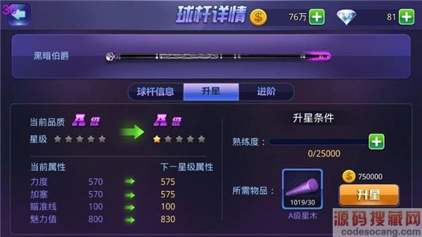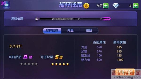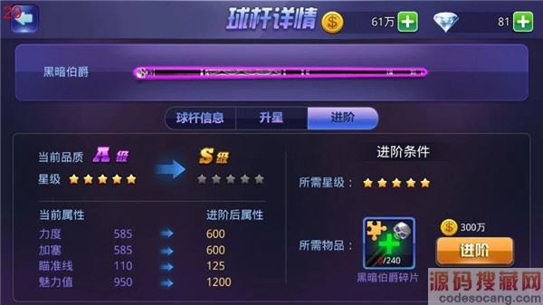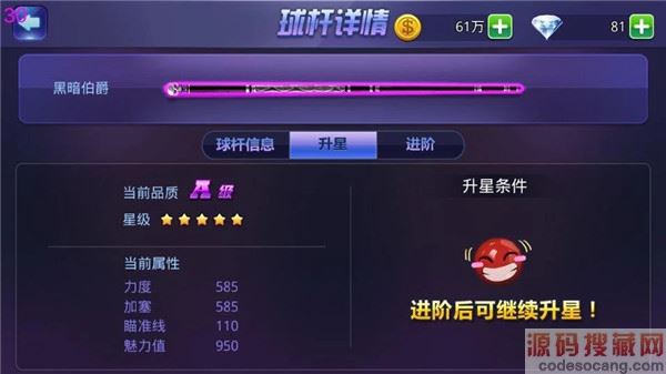1、球杆达到5星后,就可进阶了。每次进阶可提升球杆一个等级,按顺序是C<B<A<S。