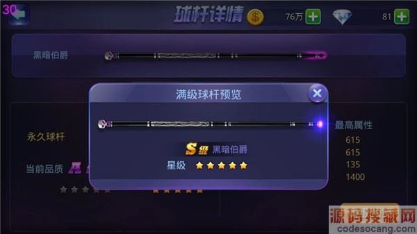 2、点击“满级预览”可以展示球杆精致的特效。可以看到黑暗伯爵的随着升星和进阶后,自身特效也开始发生了变化,达到S级之后杆头更是散发出一股冷酷而肃杀的光芒,让人不寒而栗,战意全无。不止黑暗伯爵如此,所有的球杆在升星进阶后都会产生变化。