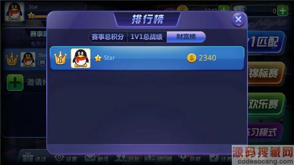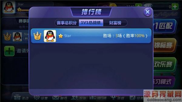 4、点击屏幕下面的”排行榜”可以看到三个榜单:赛事总积分榜、1v1总战绩、财富榜。