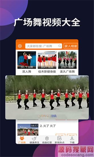 专为广大智能手机用户打造的健身必备神器,超丰富的广场舞视频大全,提供广场舞曲播放以及广场舞教学视频,在这里有着最为丰富的广场舞教学视频,各类知名老师和舞队为您领操,最科学最权威的养生资讯,最健康最美味的烹饪教学,最经典最动听的戏曲红歌,你想要的这里都有!