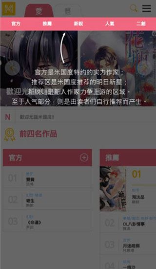 4、为用户提供各类小说、漫画等阅读功能,是原创作品的聚集地。