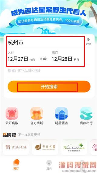 2、接下来先定位好城市,再输入入住时间和离店时间后,点击开始搜索