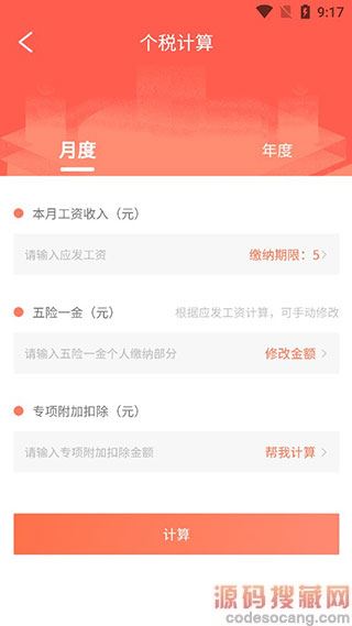 2、在计算个人所得税时,大家可以输入自己的月度工资或者是年度工资,以及五险一金的金额等来计算。