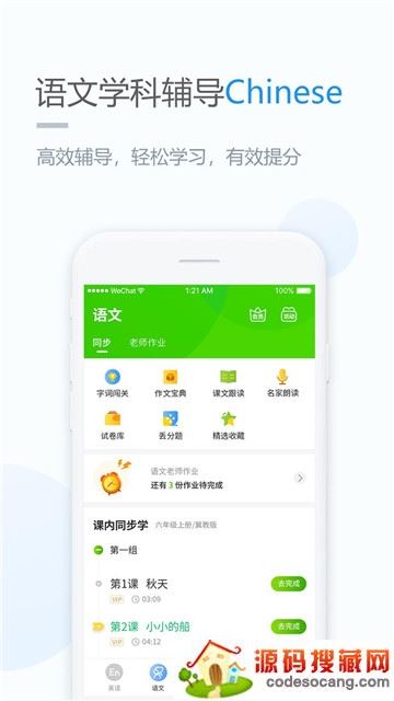 字词闯关、作文宝典、课内同步学、老师作业、课文跟读、名家朗读