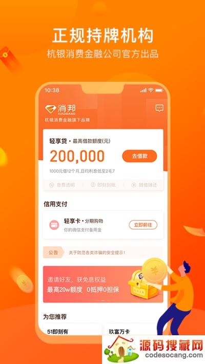 消邦app是杭银消费金融公司官方推出的一款移动金融产品,提供银行级安全、专业便捷的消费信贷服务;是一款纯信用消费贷款产品,无需抵押担保,主要凭借个人征信来申请贷款的软件。