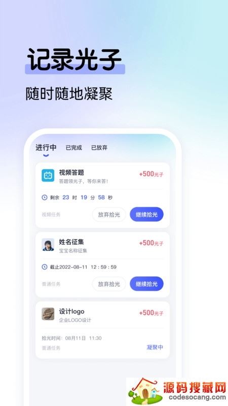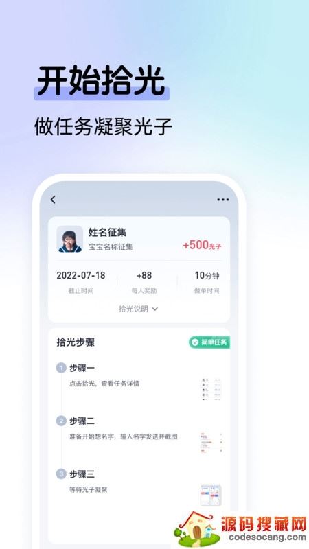 1、拾光家是一个利用用户空闲时间,完成App内发布悬赏的征集意见和想法;