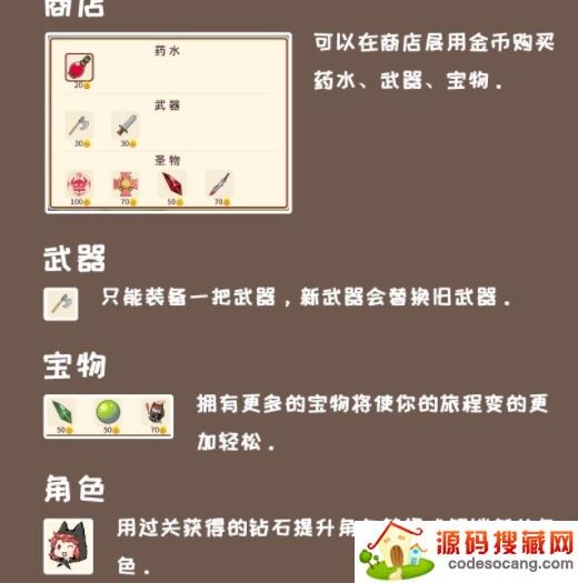 在商店层购买到的宝物或武器,会产生不同组合的技能加成效果和多种战斗方式,帮助您更顺利的完成冒险。