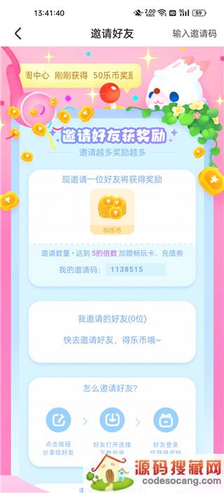 1、打开软件,点击邀请好友可以获取海量乐币,邀请达到数量更有畅玩卡、充值券