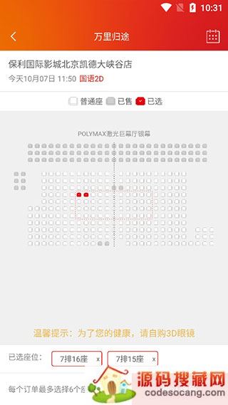 5、然后大家可以根据自己的习惯,选择自己喜欢的位置,选择完成后,点击确认选座。