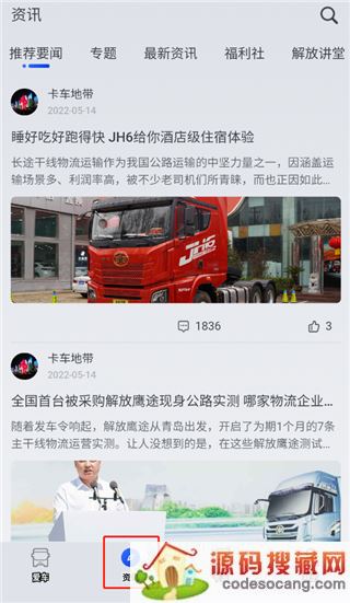 3、点击咨询,我们可以看到最新资讯、专题、解放讲堂、卡车百科、用车养车等等功能