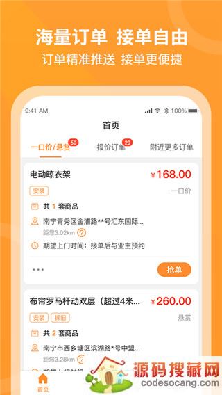 工奇兵师傅端app又名奇兵到家师傅端,它是一款家居建材维修安装的师傅接单平台,该软件适合有手艺的师傅在线接单,快速找到想要的单子,不仅提高了你的工作效率,还有超多装修订单可以任意选择,工作时间自由选,提现灵活,收益一目了然,再也不用担心找不到活干了。注册后的师傅可自主选择推送的订单进行接单,同时可以在本软件上对订单进行跟踪处理,师傅完成订单后所得佣金可提现、以及查看收入状况,并提供锁具、卫浴、晾衣架、淋浴房等多个类目的上门安装维修服务,只要你有其中一个手艺,你就具备多种选择,让师傅接单更便捷。此外,在待接单里面有丰富的订单信息,师傅可以在线报价和接单,接单以后可以与业主联系预约好处理的时间,录入以后可以生成详细的规划行程安排,可以查看每天的接单数和收入,感兴趣的朋友欢迎下载体验吧。