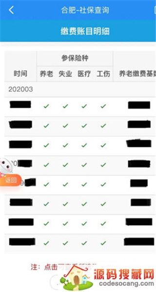 3、点击【缴费项目明细】,会显示相应的缴费账目明细,包括时间、参保险种、养老缴费基数