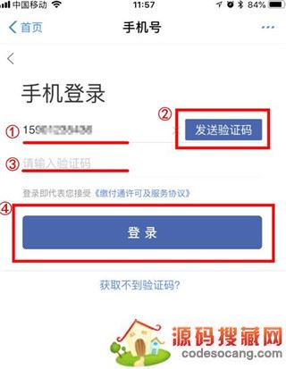 先使用手机号获取验证码登录,①填写手机号;②点击【发送验证码】;③输入验证码;④点击【登录】
