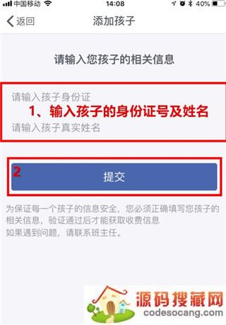 3、填写您孩子正确的身份证号和姓名,完成后点击【提交】