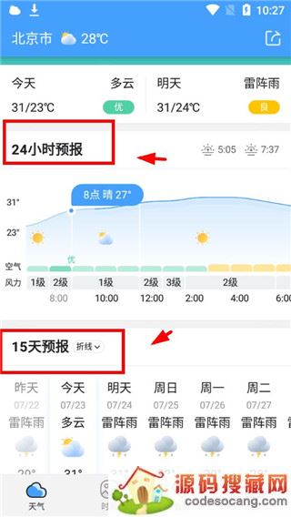 3、屏幕下拉,即可查看当天24小时,以为未来15天的天气预报信息