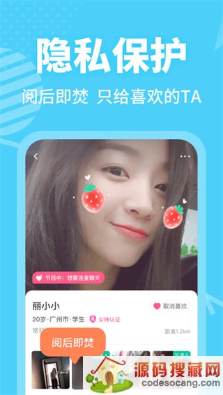 发布你专属的交友节目,下一秒,就走起。若他/她对你的节目感兴趣,需发送正脸照片才能报名,而真正的选择权还是在你。