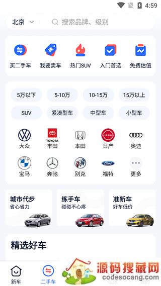 3、返回主界面,点击二手车,你可以看到相关车子品牌的二手车,以及还可以按照二手车的价格选择车子;