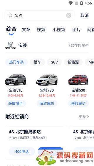 2、现在你可以看到宝骏这个品牌的车子有8款在售,另外你还可以选择轿车、新能源、suv等热门车系,或者点击任意的车子的获取底价;