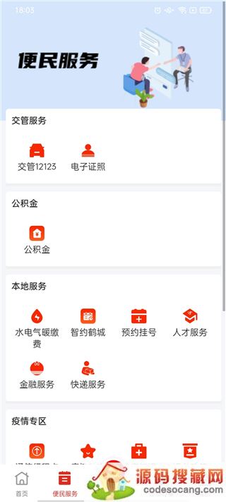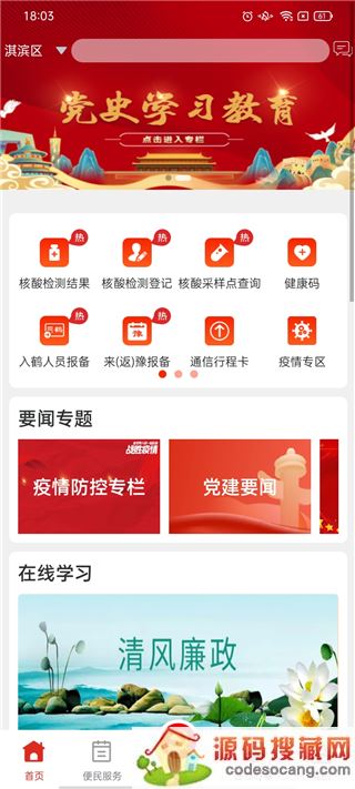 2、在首页中,拥有着核酸检测结果、核酸检测登记、核酸采样点查询、健康码、通信行程卡、疫情专区、入鹤人员报备、人才服务等服务功能;