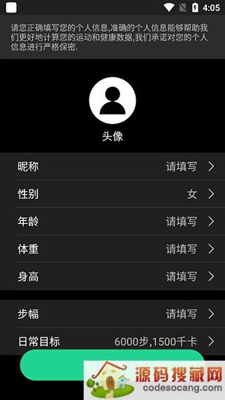 2、初次使用会弹出信息填写,可以输入昵称身体以及运动等信息,点击保存。