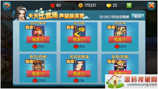 5、声望可在声望商店购买稀有道具,稀有材料和稀有将魂,每天9点,12点,18点,21点,0点会免费刷新,也可使用元宝立即刷新