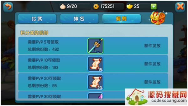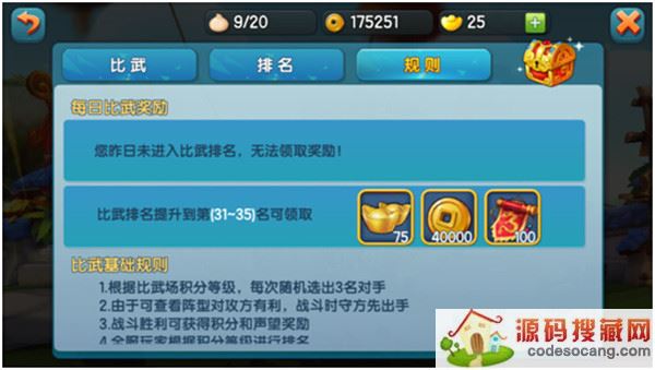 3、每场比武胜利后就立即获得PVP积分和声望奖励,比武场是根据PVP积分进行排名的,每天0点都会发放超豪华的排名奖励(含大量元宝,铜钱及声望)