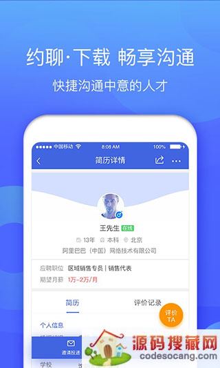 智联企业版app是智联招聘网推出的专为企业用户定制的企业招聘移动客户端,依托海量数据,强大的智能算法,链接人与机会的服务场景,致力于千里马常有,而伯乐亦常常有的美好愿景!帮助企业再上商业高峰!内含1.8亿求职者简历库,社会招聘、校园招聘,实习及兼职招聘等满足不同人群的一站式移动招聘服务,更快更好更便捷地为您解决招聘难题。人才推荐、人才搜索、便捷沟通、筛查简历等诸多功能,一键助您花最少的时间和精力,找到最符合您标准的得力干将!感兴趣的朋友们可以前来下载试试看哦!