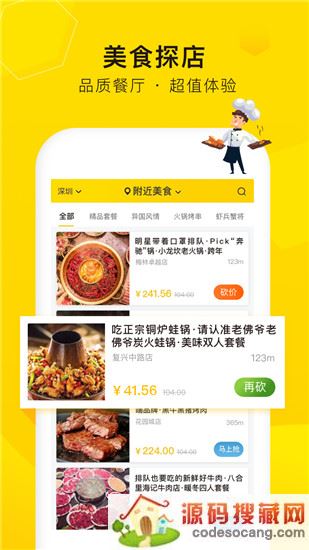 1、定位你的地点,查看身边的美食店铺,查看店铺菜单,满意的话参与砍价。