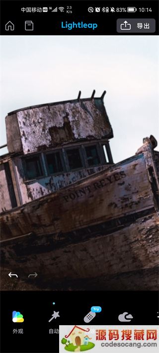 1、打开lightleap免费版本图像编辑软件后选中需要处理的图片并导入,随后便可以看到软件内支持多种修改功能,提供了外观、自动、滤镜以及调整等。