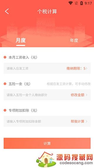2、在计算个人所得税时,大家可以输入自己的月度工资或者是年度工资,以及五险一金的金额等来计算。