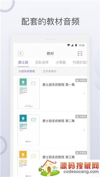 App的电子商城可以购买九拍各个学科的系统教材及考级教材,通过教材扫码解锁功能,在App中可以解锁教材中所有的示范音频和伴奏音频。