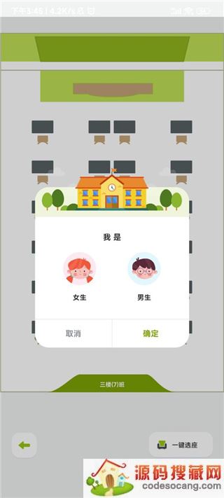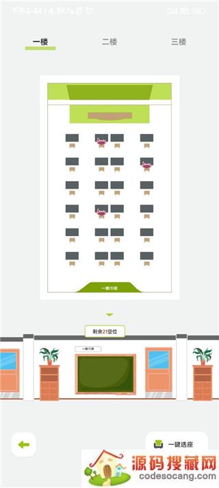 3、点击进入学习楼,总共有三层楼层,每一个班级剩余的座位会显示出来,右下角可以一键选座;