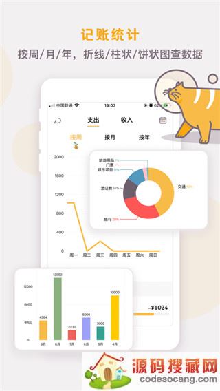 - 统计视图:按周、按月、按年统计记账数据,柱状图一目了然