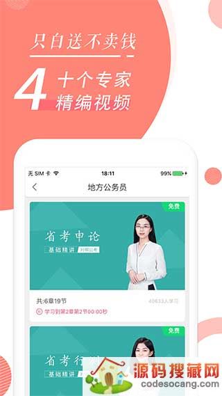 公务员随身学app是由北京对啊网教育科技有限公司打造发布的一款公务员考生量身打造的移动端学习软件。该软件拥有丰富的公考学习资源,不仅有课程、视频、题库、教材和论坛内容,提供大量公务员考试学习资料,轻松让用户可以通过软件进行知识学习,为用户考试上岸提供帮助。用户还可以在公务员随身学app上进行考题练习,巩固考试知识点,获取历年真题卷、模拟卷,进行在线模拟考试,随时随地检测一下自己的学习效果。软件界面简洁,操作方法简单,能够很好的给用户提供通俗易懂的课程讲解,帮助用户理清考点、罗列大纲、掌握知识点,进行充足的备考。除了在线学习,用户有相关公告问题,也可以在论坛上进行咨询了解。欢迎有需要的朋友来本站下载!