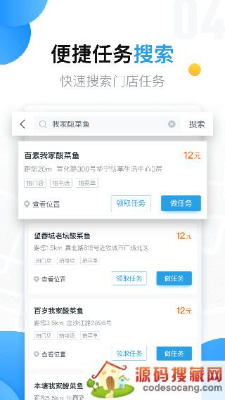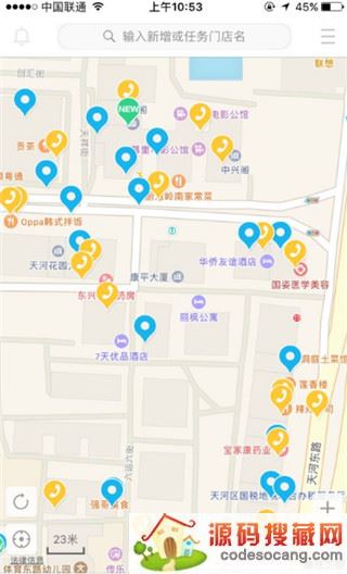 1、打开软件,地图上有很多任务点,这里的任务都是定期投放的任务点,即需要采集的店铺。任务类别有:蓝色标志的普通拍店任务/黄色标志的必拍电话任务/店铺标志的巡店任务/绿色标志的新任务。