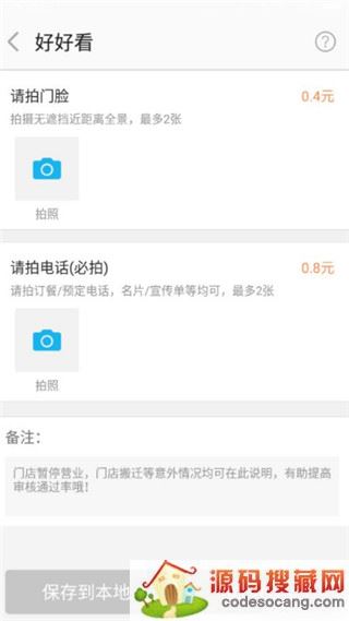 3、如果“找到门店”用手机按照提示拍照,注意要照片清晰看得清店铺名和电话。然后保存到本地或者立即提交(保存本地的任务需要三天内提交)。