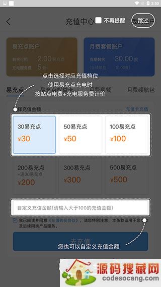 2、点击选择对应【充值档位】,使用易充点充电时按站点电费+充电服务费计价,您也可以自定义充值金额。